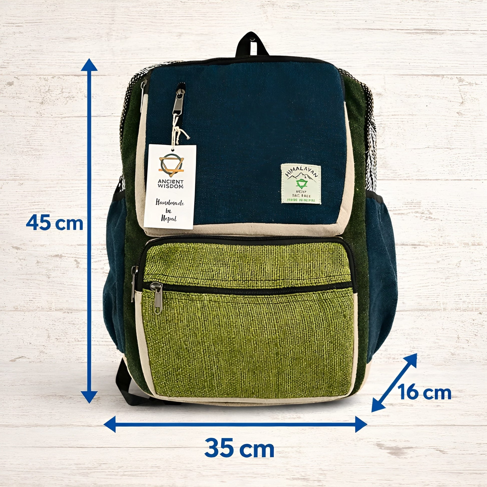 Product information: Material: hemp & cotton blend; Color: Teal & Sage; Style: large boxy backpack; Country of origin: India